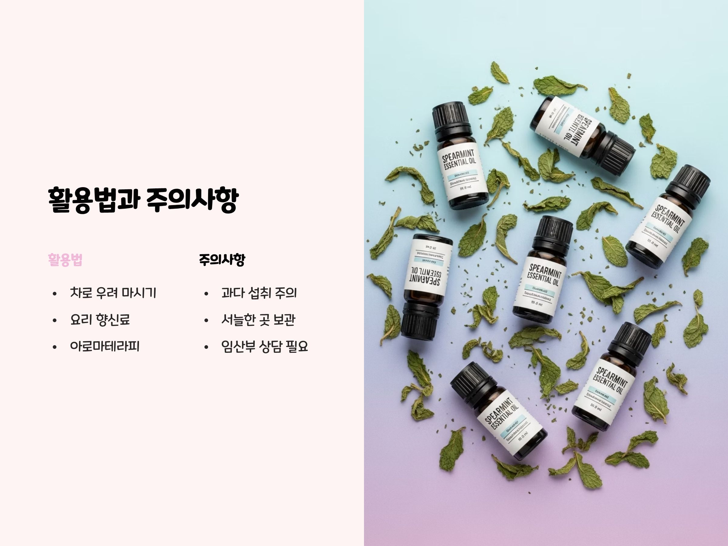 스피어민트는 생잎, 건조 허브, 오일 등 다양한 형태로 활용할 수 있습니다.
