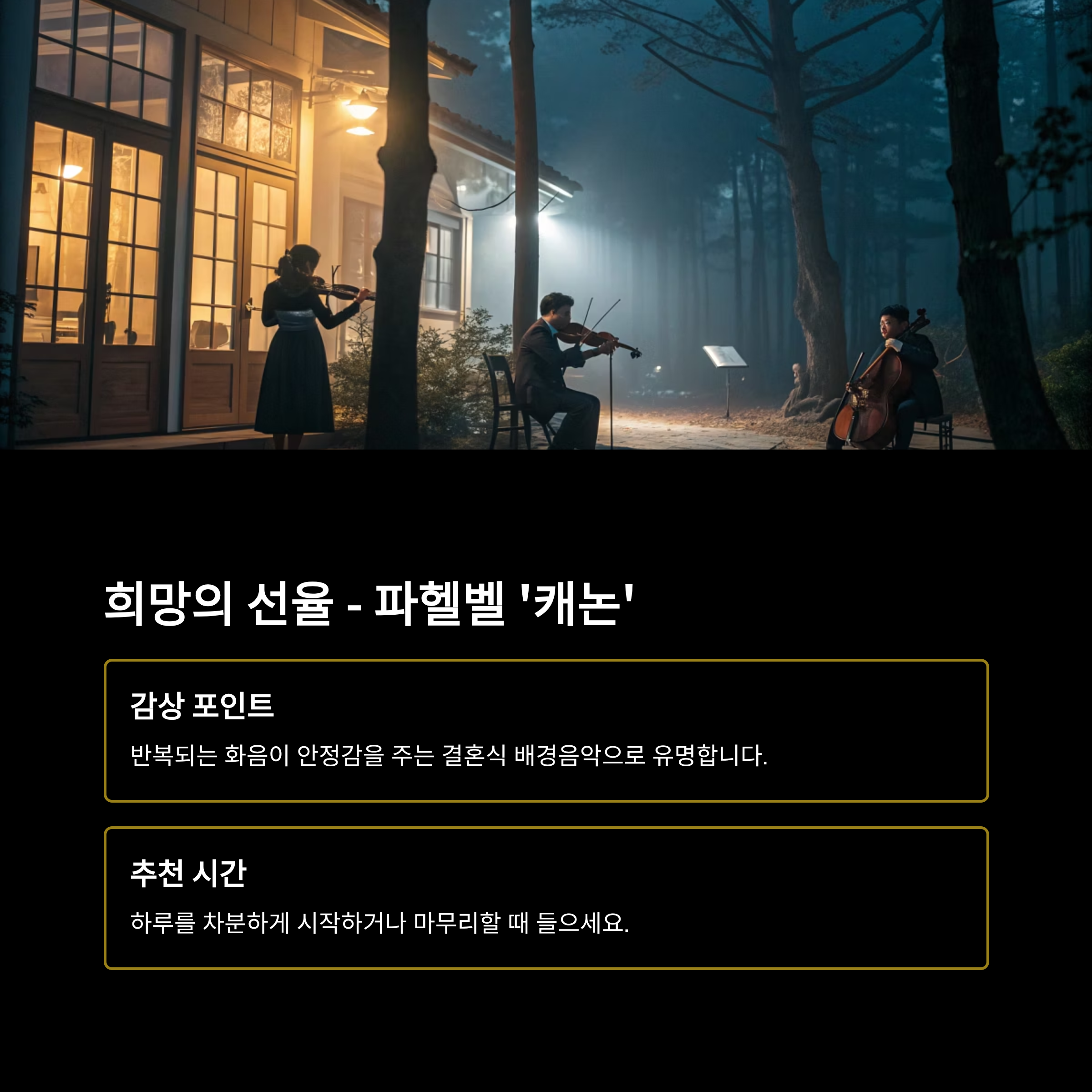 결혼식 배경음악으로 유명한 이 곡은 반복되는 화음이 안정감을 줍니다.