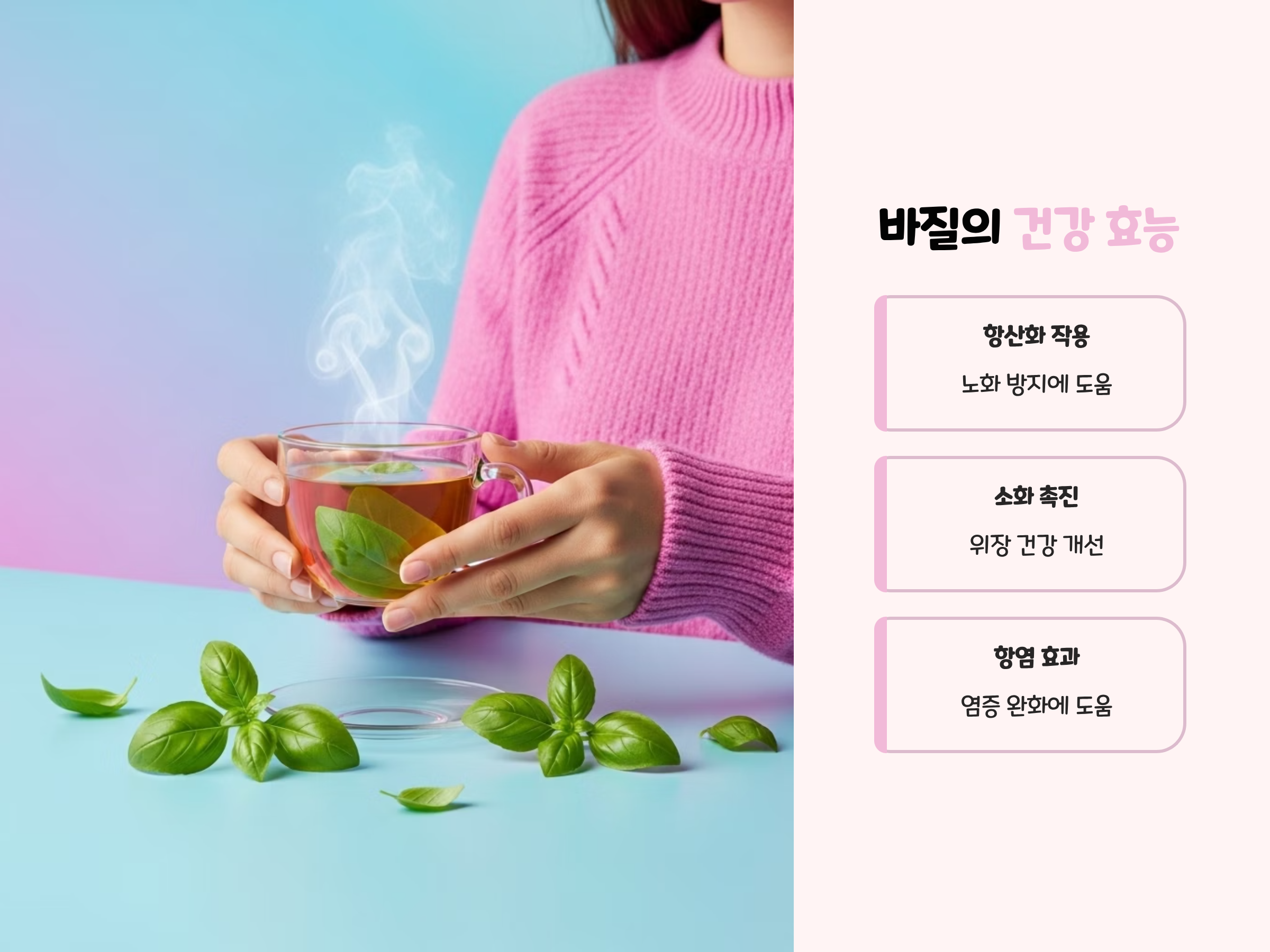 A: 바질차는 소화를 돕고 긴장을 완화하는 데 도움을 줄 수 있습니다. 은은한 향이 심신 안정에도 효과적입니다.