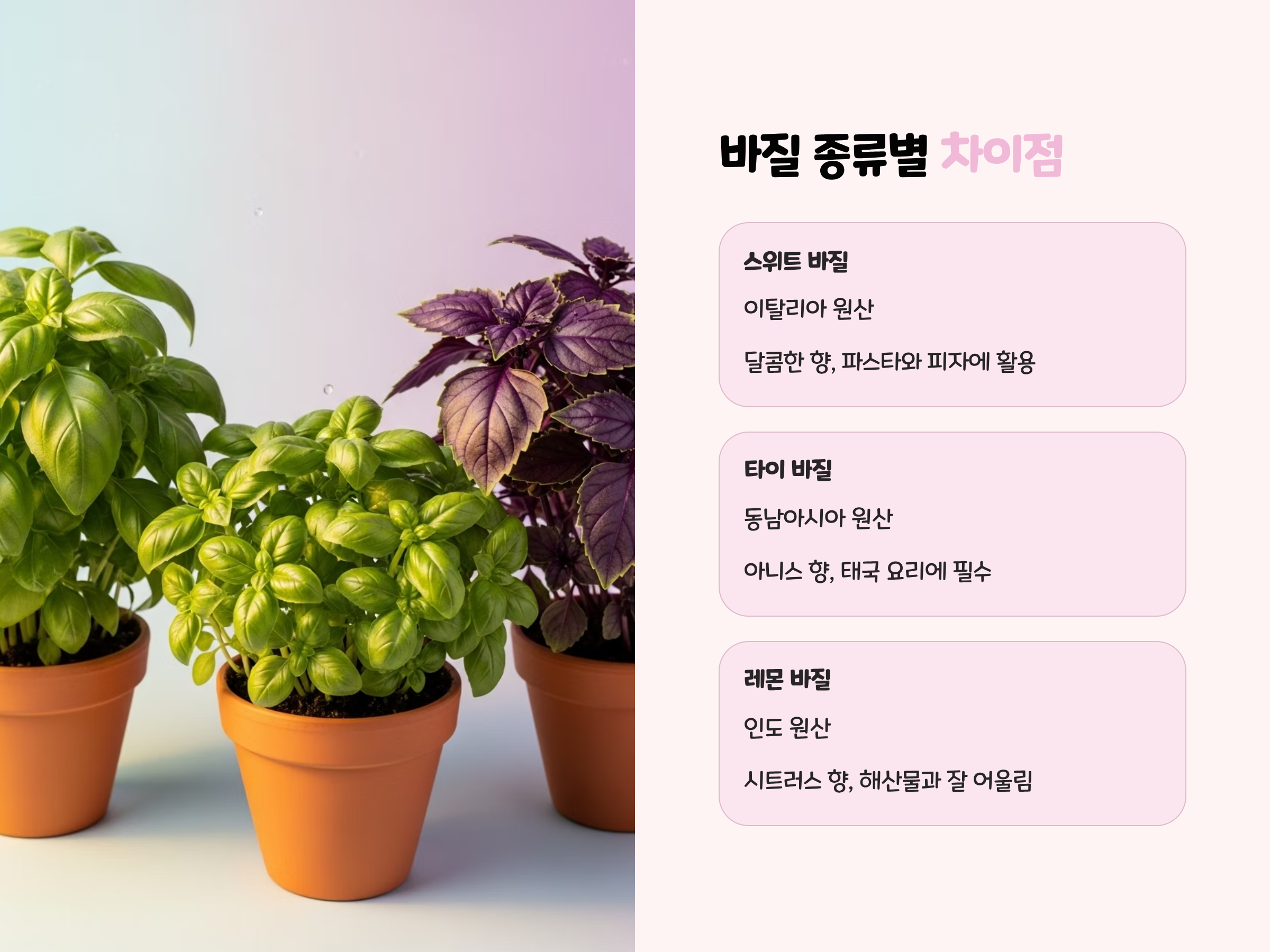 바질의 종류와 특징을 한눈에 비교! 각각의 원산지, 효능, 활용법까지 총정리한 정보 가이드입니다.
